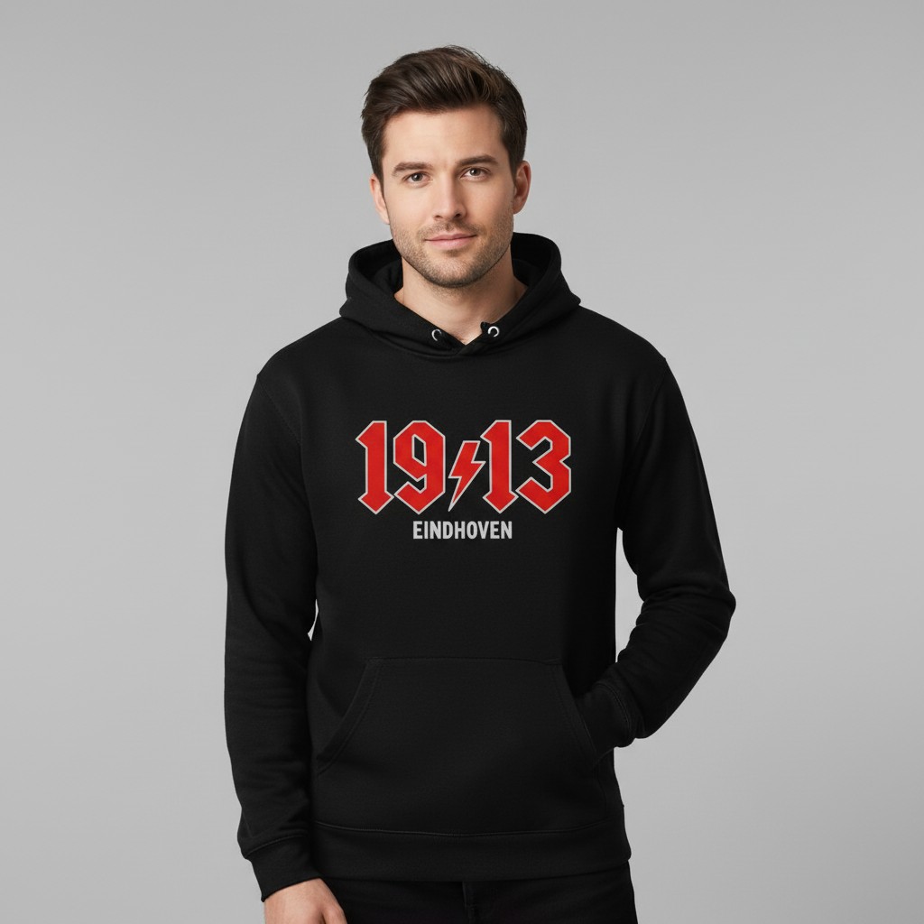 1913 Eindhoven trui met capuchon. Trui heeft een grote zak bij de buik. Het is een unisex model. Verkrijgbaar voor volwassenen en kinderen.