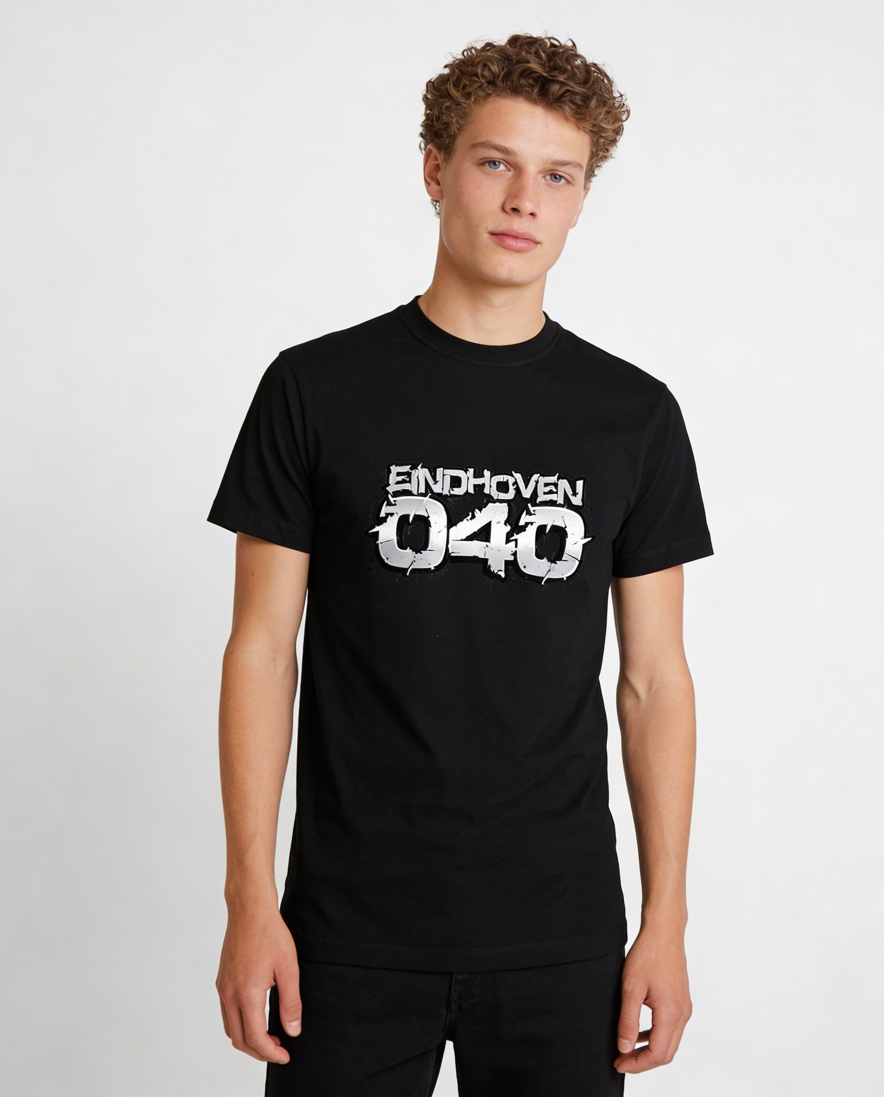 Eindhoven 040 t-shirt, zilver en grijze print op een zwart katoen shirt. Verkrijgbaar voor volwassenen en kinderen. Unisex model.