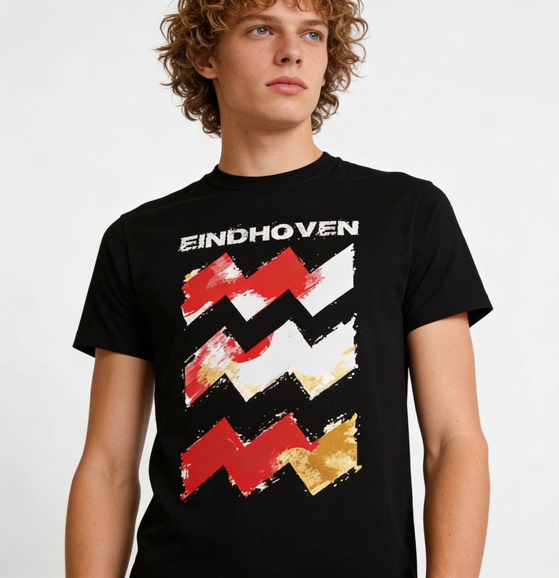 Eindhoven logo in kleur op zwart shirt, unisex model. Verkrijgbaar voor kinderen en volwassenen.